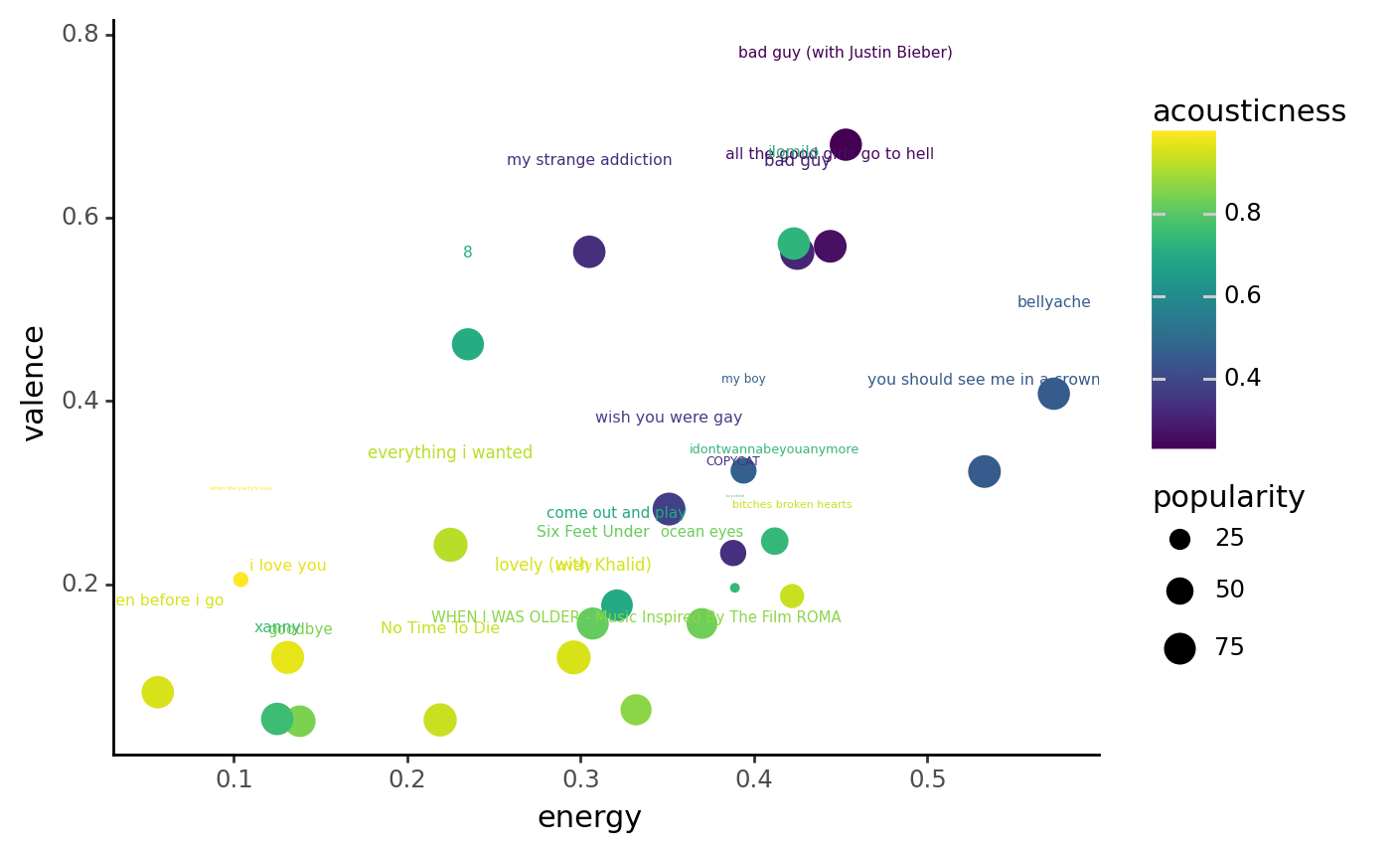 | artist | album | track_name | energy | valence | danceability | speechiness | acousticness | popularity | duration | |
